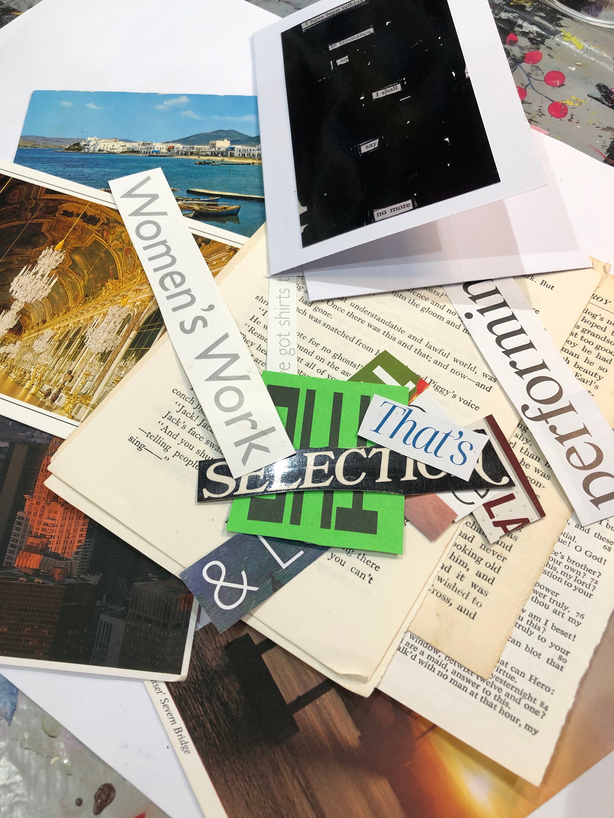 I've included a few vintage postcards, some loose book pages from old books, lot of words, and one of my blackout poetry greeting cards.
