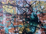 A photograph I took of local Plane trees has been transferred onto the painted surface. I’m drawn to how the creative process sharpens my attention: how a simple, quickly captured image can become part of a slower, more integrated way of making.